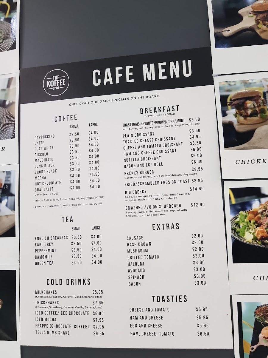 The Koffee Spot specializes in serving up comfort food with a twist, ensuring that every bite is a pleasure. Their menu features a selection of fresh salads like the Garden Salad, Caesar Salad, and Greek Salad, perfect for those looking for a light yet fulfilling meal. But it's the café's hearty Kiddies Meals that steal the show; choices like Pluto Pup & Chips, Cheeseburger & Hot Chips, and 6 Pack Chicken Nuggets and Hot Chips are bound to satisfy even the pickiest eaters.